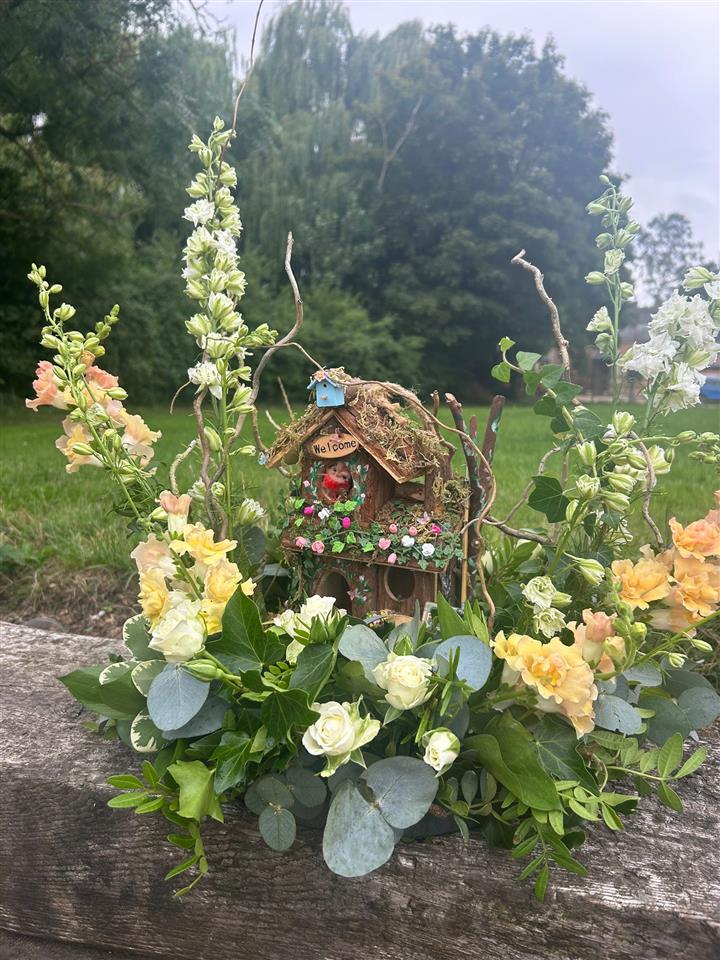 A Woodland flower Tribute with a Handcrafted Bird Box