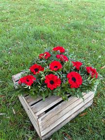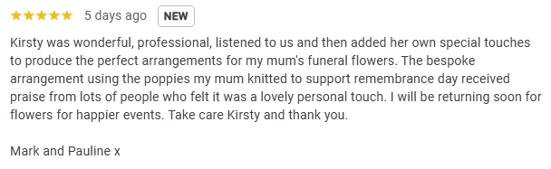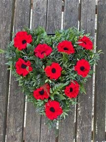 One family asked us to create a heart funeral flowers design, a little bigger than the size of a dinner plate, made with foliage and soft seasonal flowers. Their late mother had hand-knitted remembrance poppies, which they still had some of.