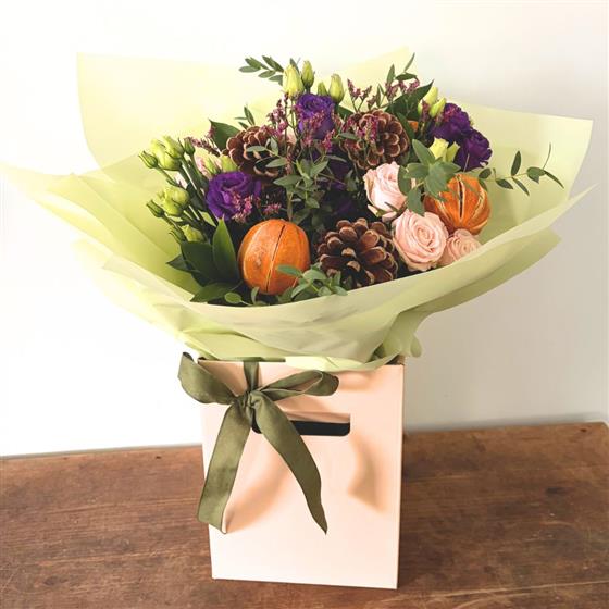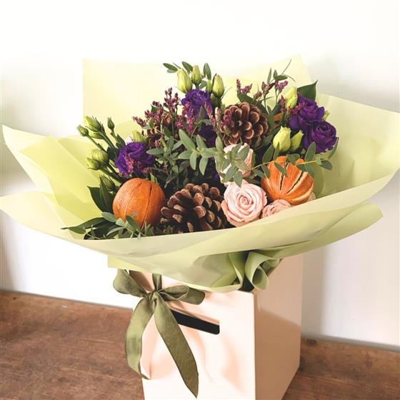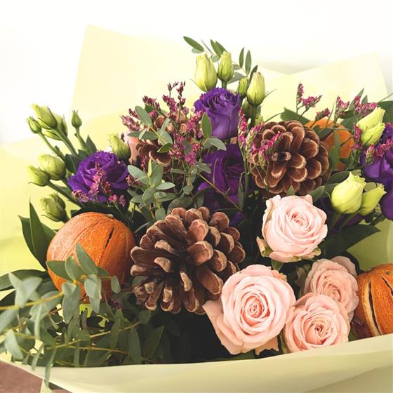 Think Cadbury’s purple lisianthus, blush spray roses, and pink limonium — with whole dried oranges (a little nod to Chocolate Orange season, of course) and pine cones tucked among fresh festive foliage. It’s like tucking into your favourite chocolate selection box on Christmas morning but in bouquet form.