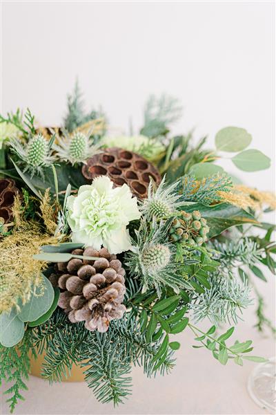 Crafted in a reusable ceramic pot, this Xmas flower arrangement features long-lasting seasonal foliages, accented with touches of gold asparagus fern, thistles, and vibrant green carnations. The fresh seasonal arrangement is complemented by charming dried elements, including pine cones and lotus heads, adding texture and seasonal flair.