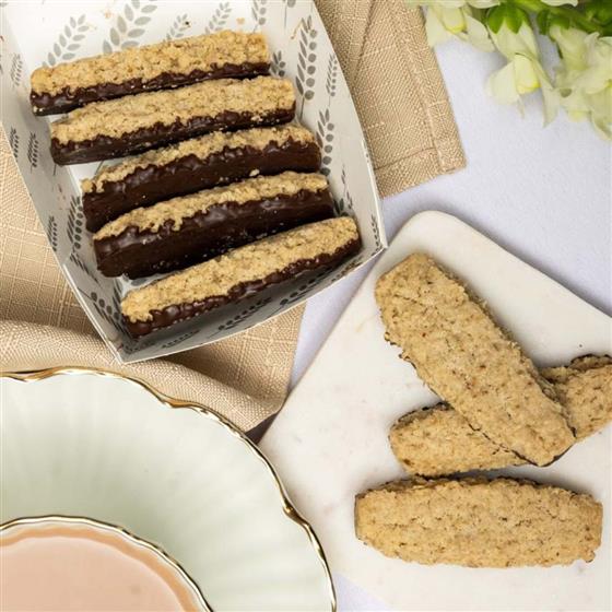 🍪 Dark Chocolate Oat Flips – Golden oat biscuits, half-coated in rich dark chocolate — a true crowd-pleaser.
