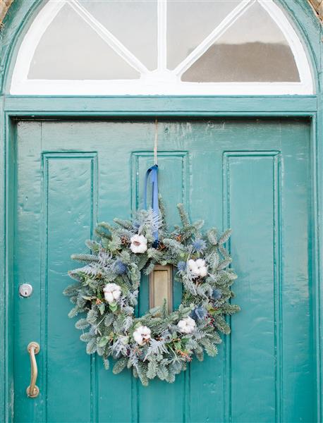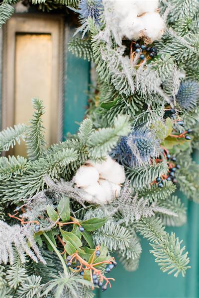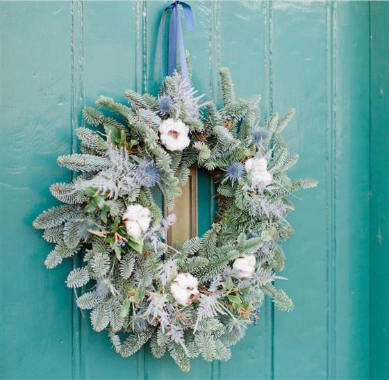 Frosty Christmas Wreath for Door. This traditional, handmade wreath features a luxurious blend of mixed seasonal winter pine foliages, enhanced with fresh blue thistles and charming dried cotton stem heads.