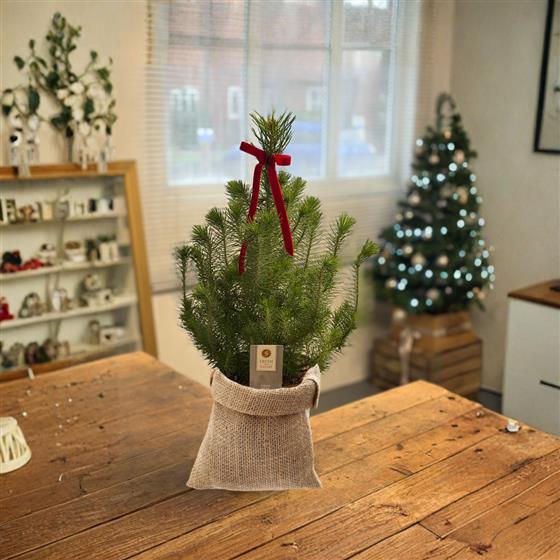 Our Real Mini Christmas Tree with Lights is the cutest little slice of festive magic you’ll ever pop on a table, windowsill, desk, or kitchen counter. Standing at around 2ft tall in a 17cm pot, this dinky real tree arrives wrapped in rustic hessian, topped with a gorgeous red velvet bow, and finished with battery LED lights so it’s ready to place, switch on, and instantly feel Christmassy.